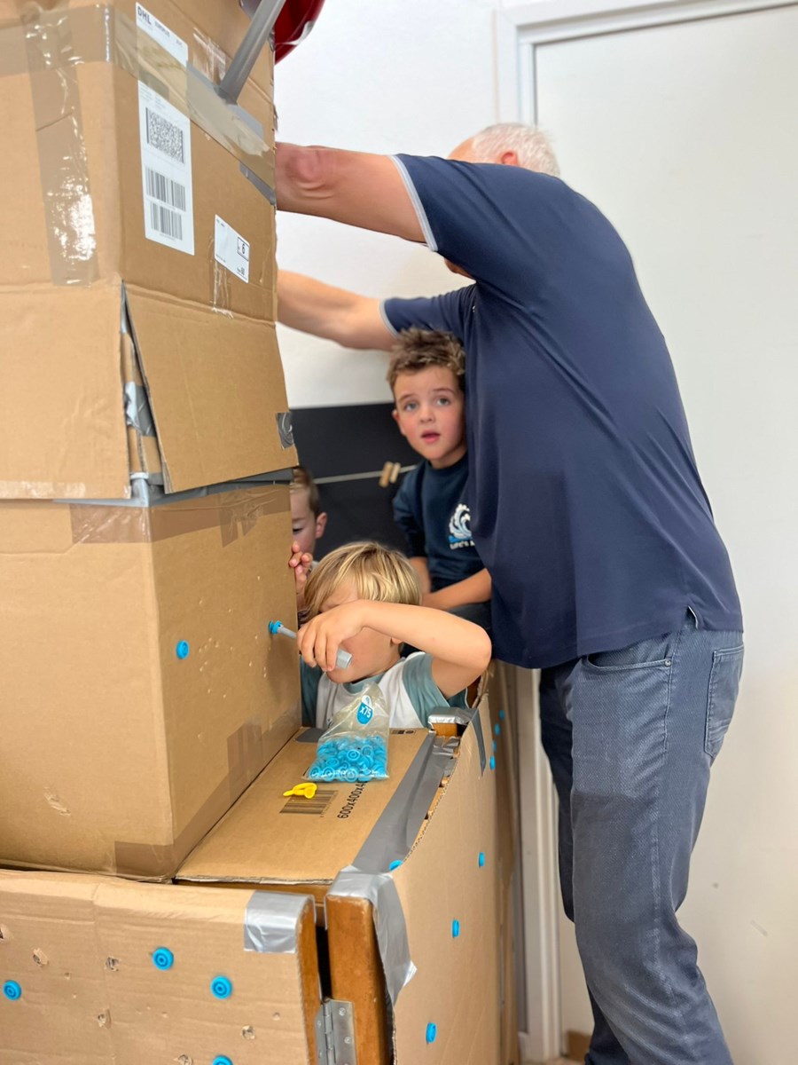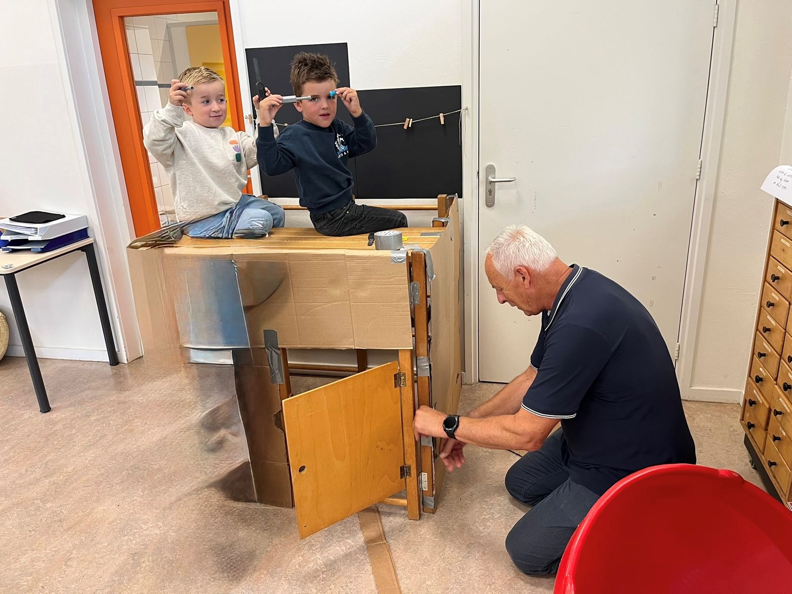 Met hulp van opa Piemie (van Sef) ging de raket de hoogte in. En met meer dan 40 schroeven is stevigheid gegarandeerd.